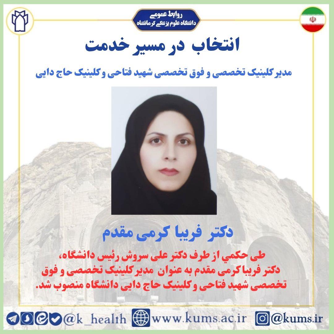 طی حکمی ازطرف دکتر علی سروش رئیس دانشگاه علوم پزشکی کرمانشاه، دکتر فریبا کرمی مقدم به عنوان مدیر کلینیک تخصصی و فوق تخصصی شهید فتاحی و کلینیک حاج دایی دانشگاه منصوب شد.